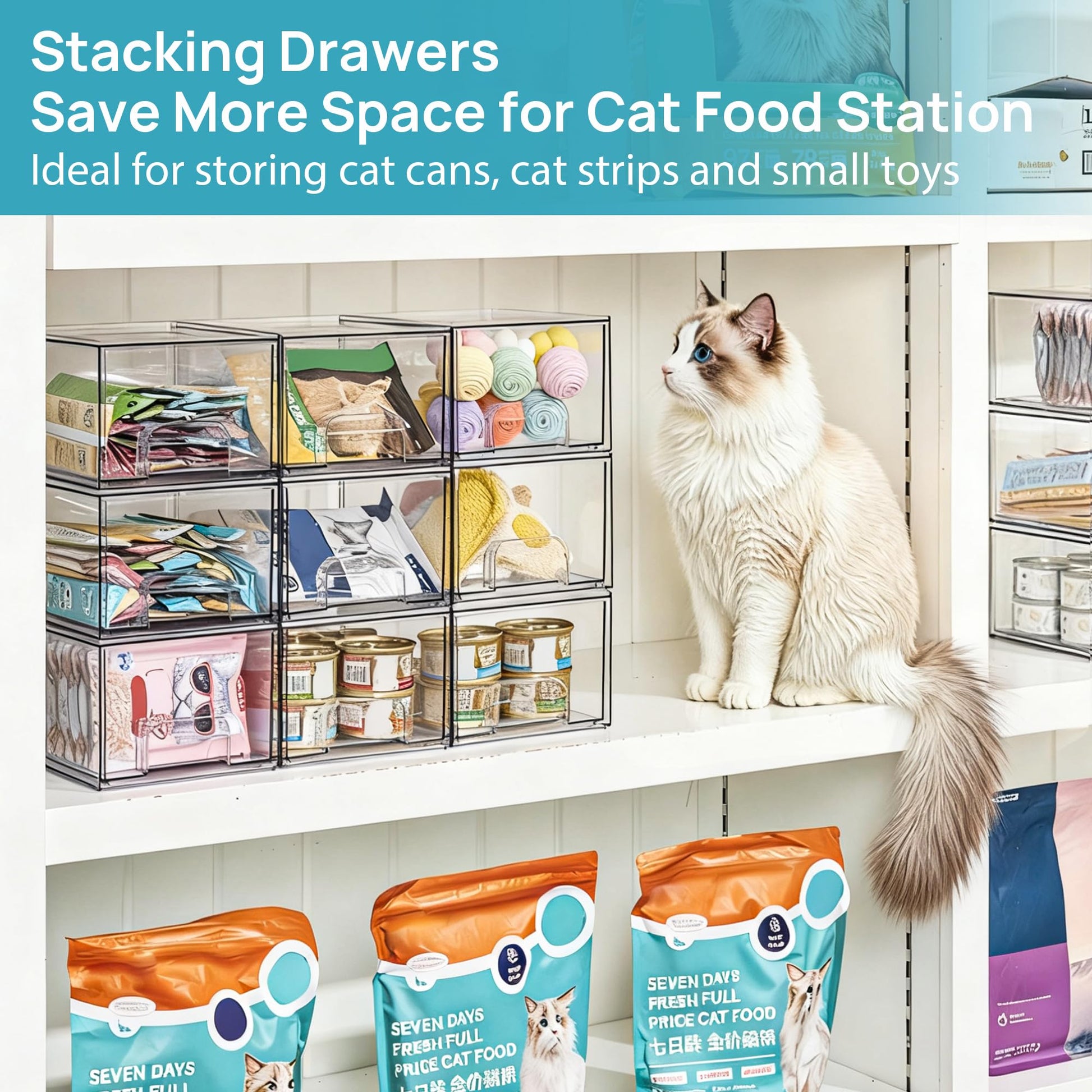 - [Stackable Design] Come with 6 drawer storage organizers, each organizer measures 7.5"D x 6"W x 4.4"H. The storage containers are stackable, vertical storage will save a lot of space. You can also use them side by side. Put your small objects on top of acrylic bins to make your countertop space more tidy.