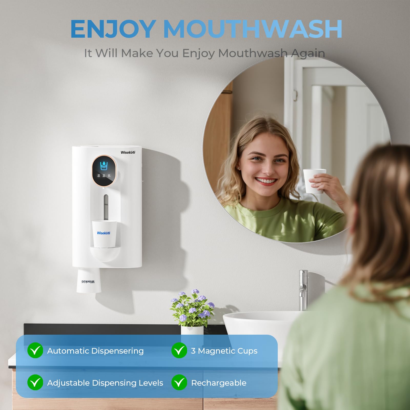 - 【Enjoy Mouthwash】The Automatic Mouthwash Dispenser's 3 Adjustable Dispensing Levels, 3 Different Colored Markings Magnetic Cups, And Sophisticated Design All Of These Will Make You Enjoy Mouthwash Again. We Are Very Confident You Will Love Our Product. We Offer A One-Year Warranty for Your Peace of Mind. Please Feel Free to Contact Us If You Have Any Questions about the Use of The Product.